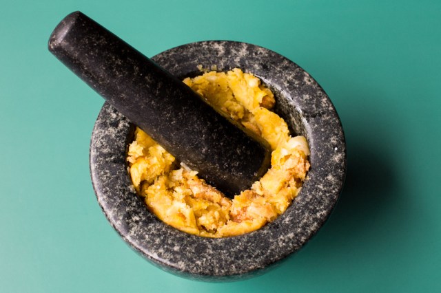 Fufu made it into several Caribbean cuisines, with varying levels of alteration. In Cuba, it is known as Fufu de Platano, and in the Dominican Republic it carries the name Mangú. In Puerto Rico, it is almost always made with plantains, but yuca and breadfruit variations exist. The plantains are typically smashed using a wooden mortar and pestle called a pilon, and sometimes served directly in the pilon. My stone mortar and pestle gets the job done nicely.
