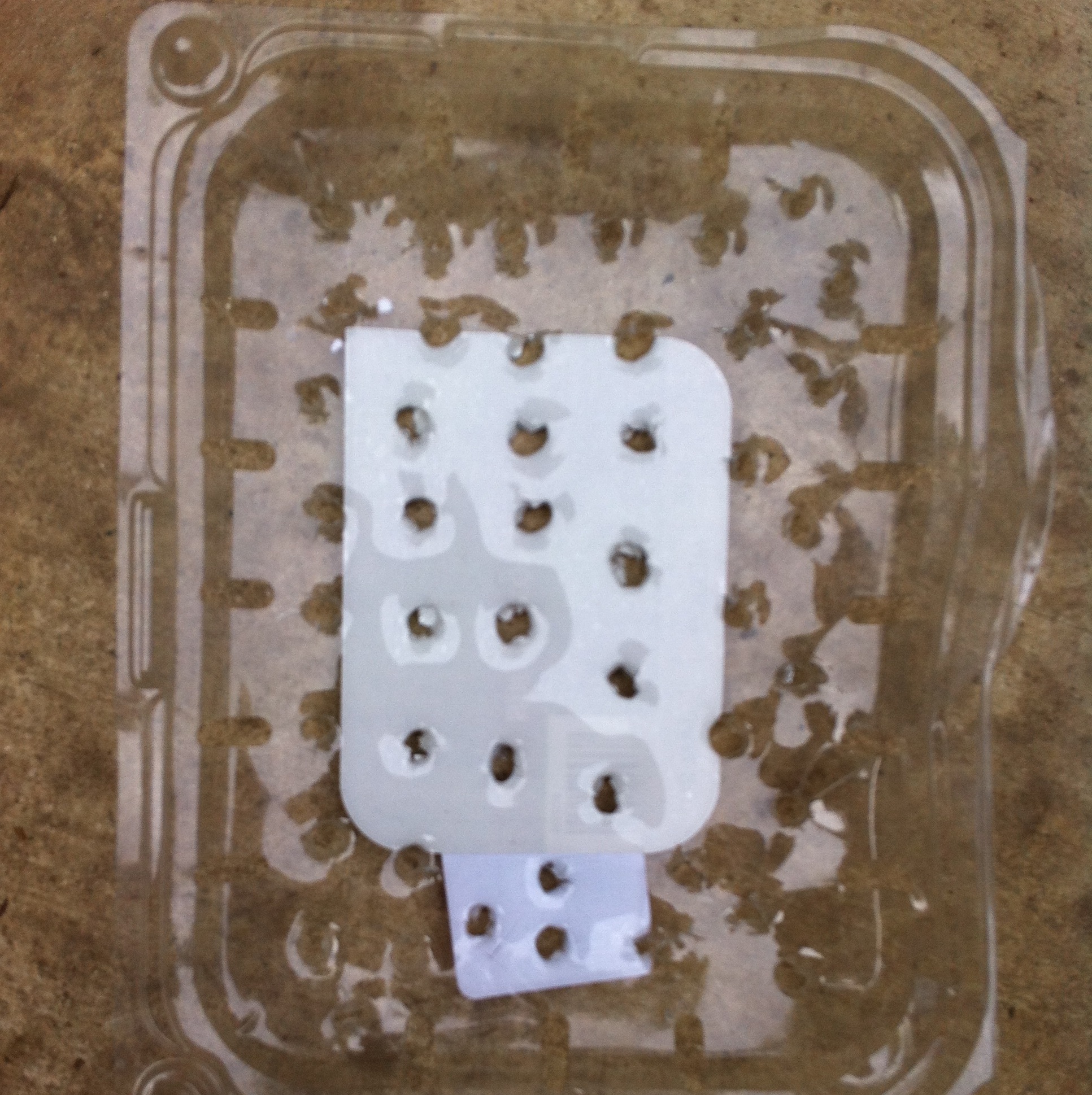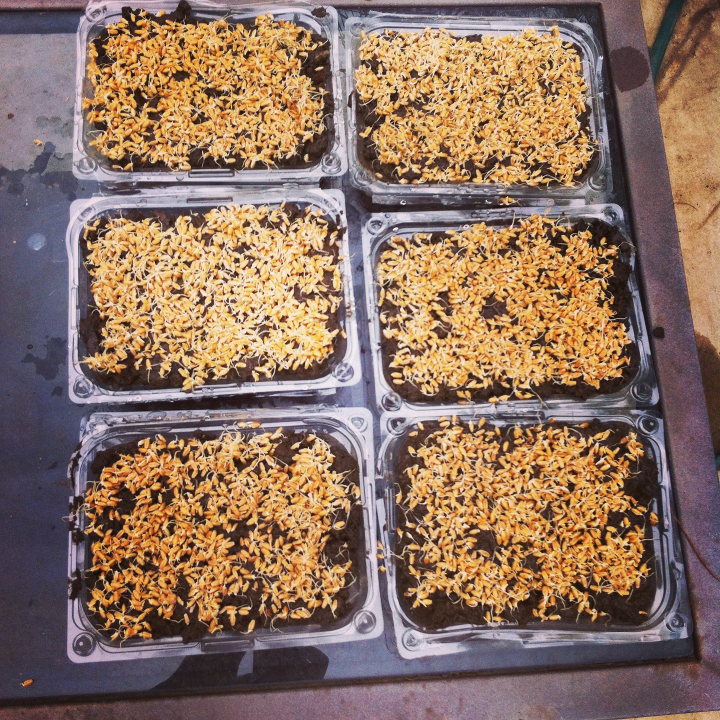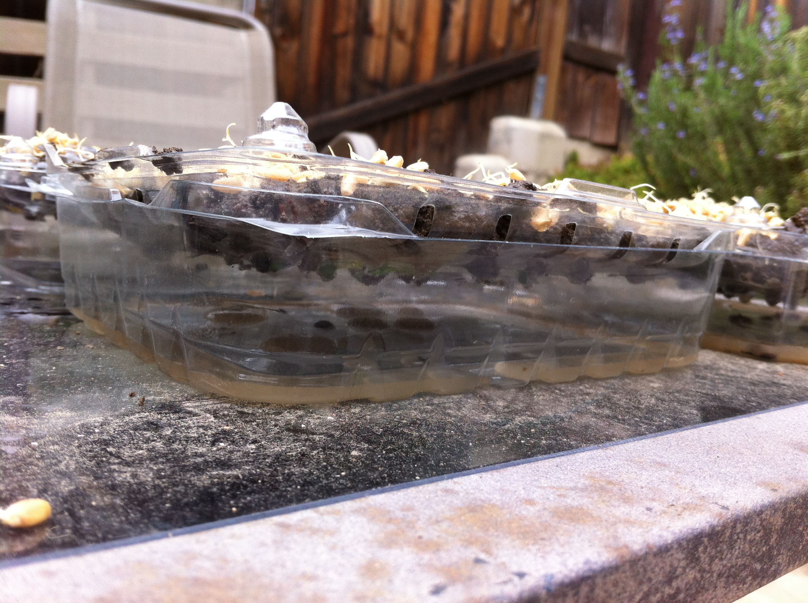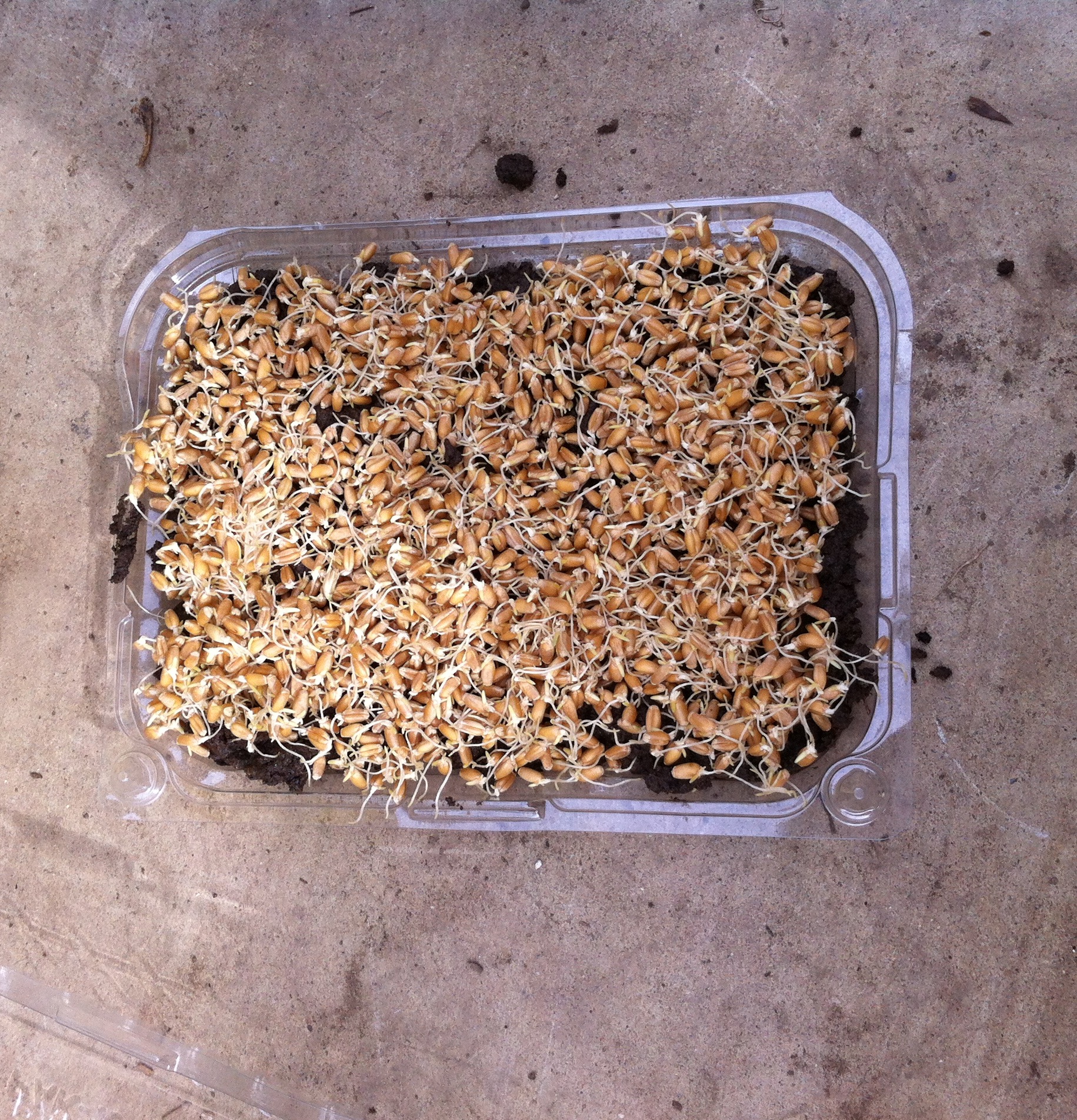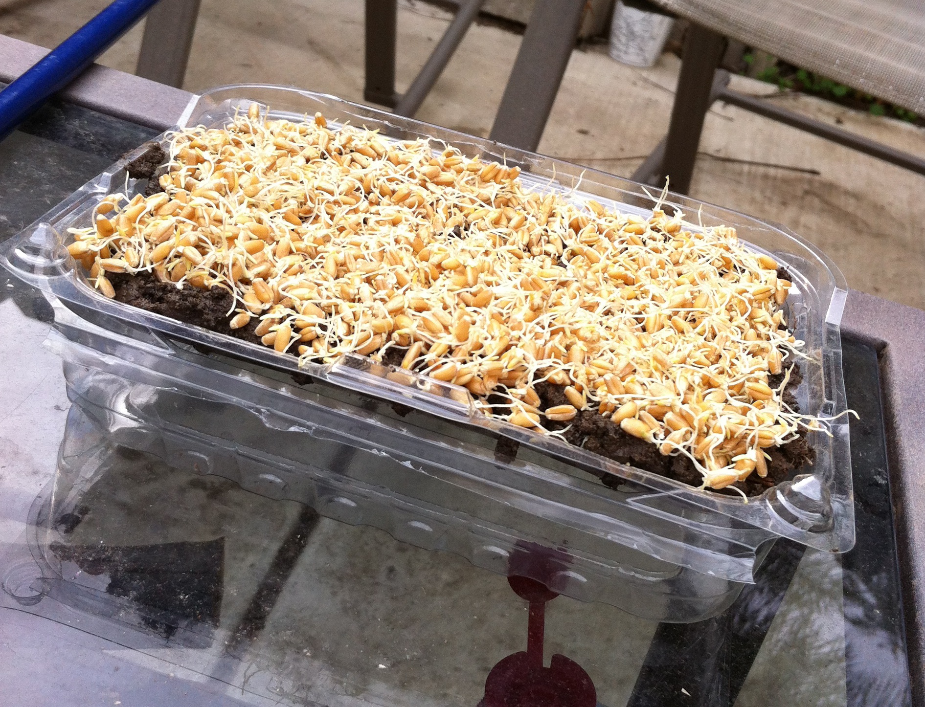 At the Farmer’s Market, we tried a shot of wheatgrass from one of the vendors. She kept telling us how great the stuff is for teeth and gums, which of course made us look right at her mouth. Her teeth and gums looked really healthy! Her skin also looked very clear. You could tell she wasn’t wearing much makeup at all if any. I’ve been reading about growing wheatgrass for a while now, so we ended up buying some seeds from her that were already sprouted. Only $4.50 for a giant bag! I planted quite a bit, but still have a lot left! I need to make more growing trays. Anyway, this is my first time growing this, and I created a makeshift tray out of some leftover tomato plastic containers from Fresh N Easy: